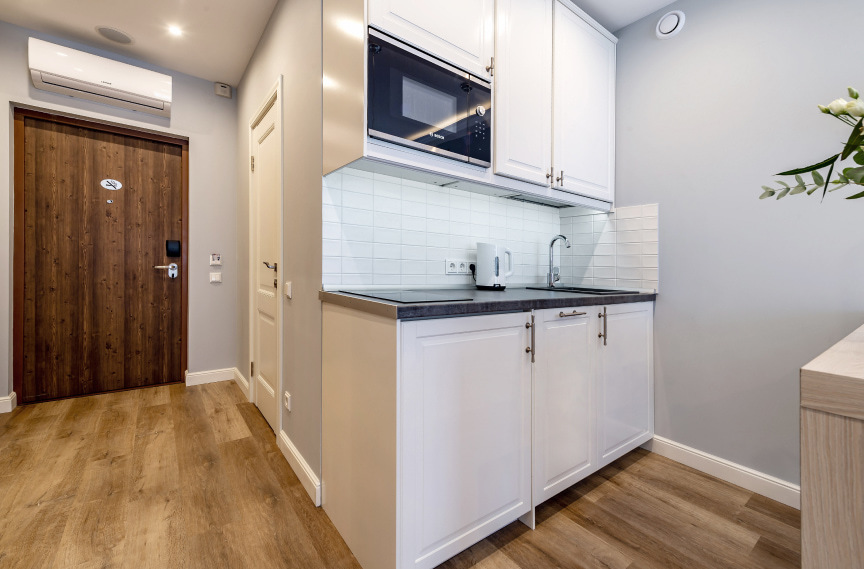 - Студии — для 1–2 человек, компактная кухня, базовый набор мебели. Подойдут для романтического уик-энда или одиночного путешествия.